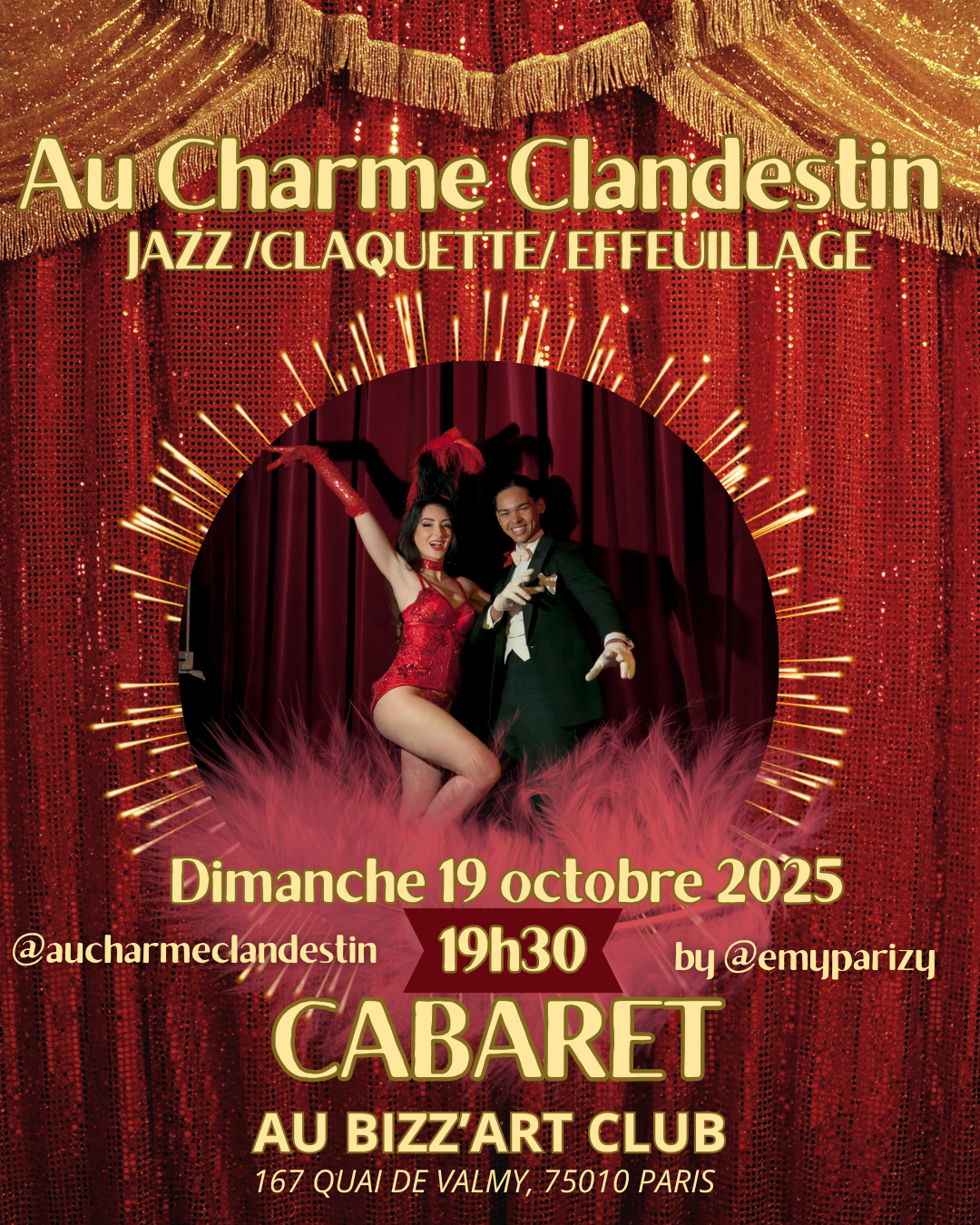 Dans l’ambiance feutrée et festive du Charme Clandestin, laissez-vous emporter par le swing irrésistible d’un groupe de jazz live, les rythmes endiablés d’un claquettiste virtuose, et les numéros élégants et sensuels d’une effeuilleuse burlesque.