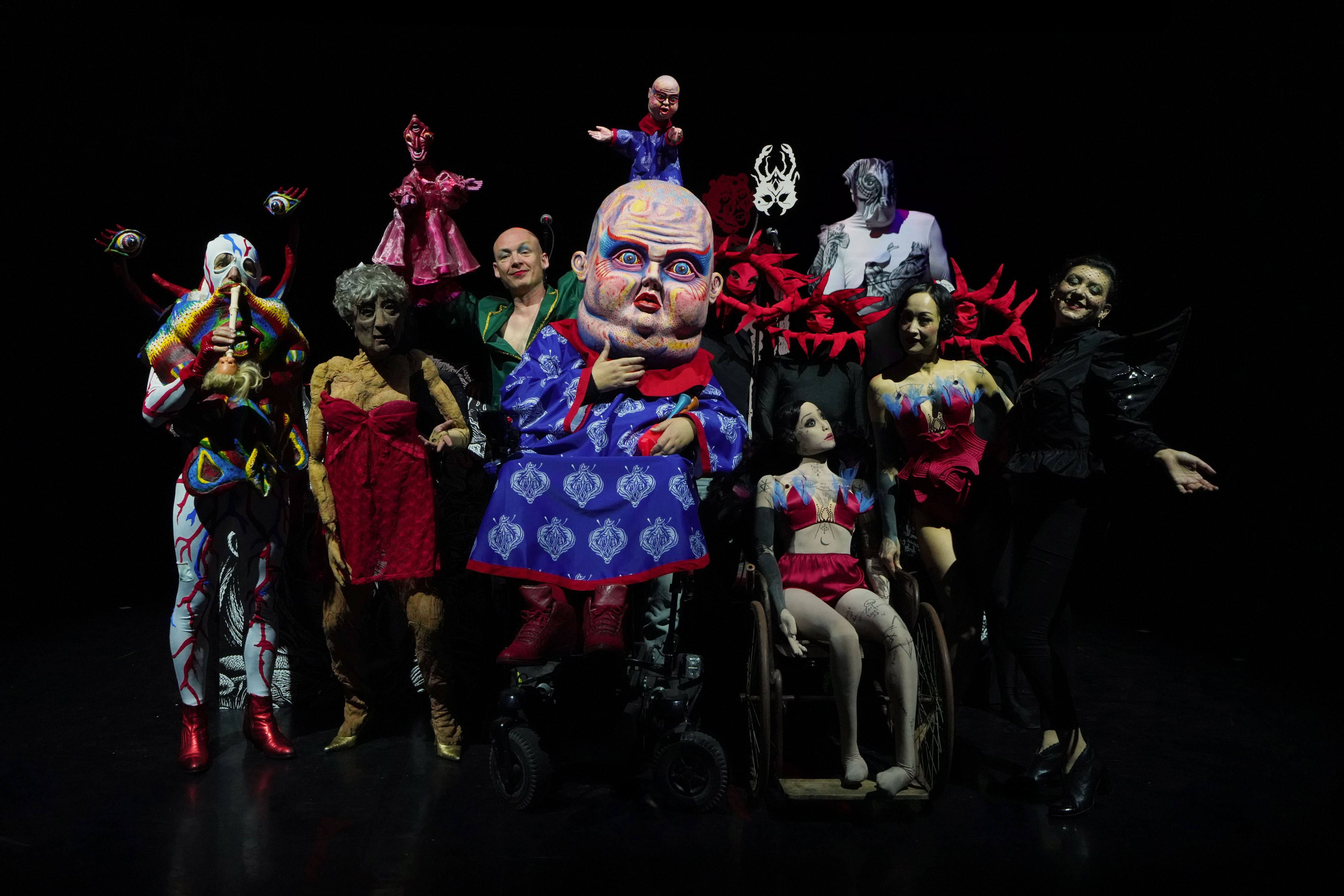 Après une première collaboration pour Les Leçons d’Anatomies Chimériques, Angélique Friant et le plasticien polymorphe Stéphane Blanquet se retrouvent pour créer une forme spectaculaire qui mélange l’univers organique et chimérique du dessinateur et le monde du théâtre de la marionnettiste. Dans la grande tradition du cabaret, ils composent avec des numéros mais c’est à la manière des dadaïstes qu’ils jouent avec les images, les marionnettes et les mots. En maître de cérémonie, Emmanuel Hubaut, chanteur-leader du groupe culte Les Tétines noires, et leader d’EHb, anime ce cabaret hypnotique où défilent performeurs, comédiens et leurs doubles marionnettiques, sensualité vénéneuse et fakirisme avec Lalla Morte, jeux de masques et de miroirs, poésie et érotisme. Grâce au travail plastique, marionnettique et vidéo, Soupirs mouillés sous les talons glisse doucement vers une inquiétante étrangeté, un rêve luxuriant peuplé de personnages hybrides, mi-humains, mi-insectes ou mi-végétaux. Dans cette fantasmagorie, émerge au fur et à mesure une véritable installation où le public pourra circuler à la fin du spectacle. Une invitation dans un monde troublant où la poésie visuelle côtoie un imaginaire débridé.