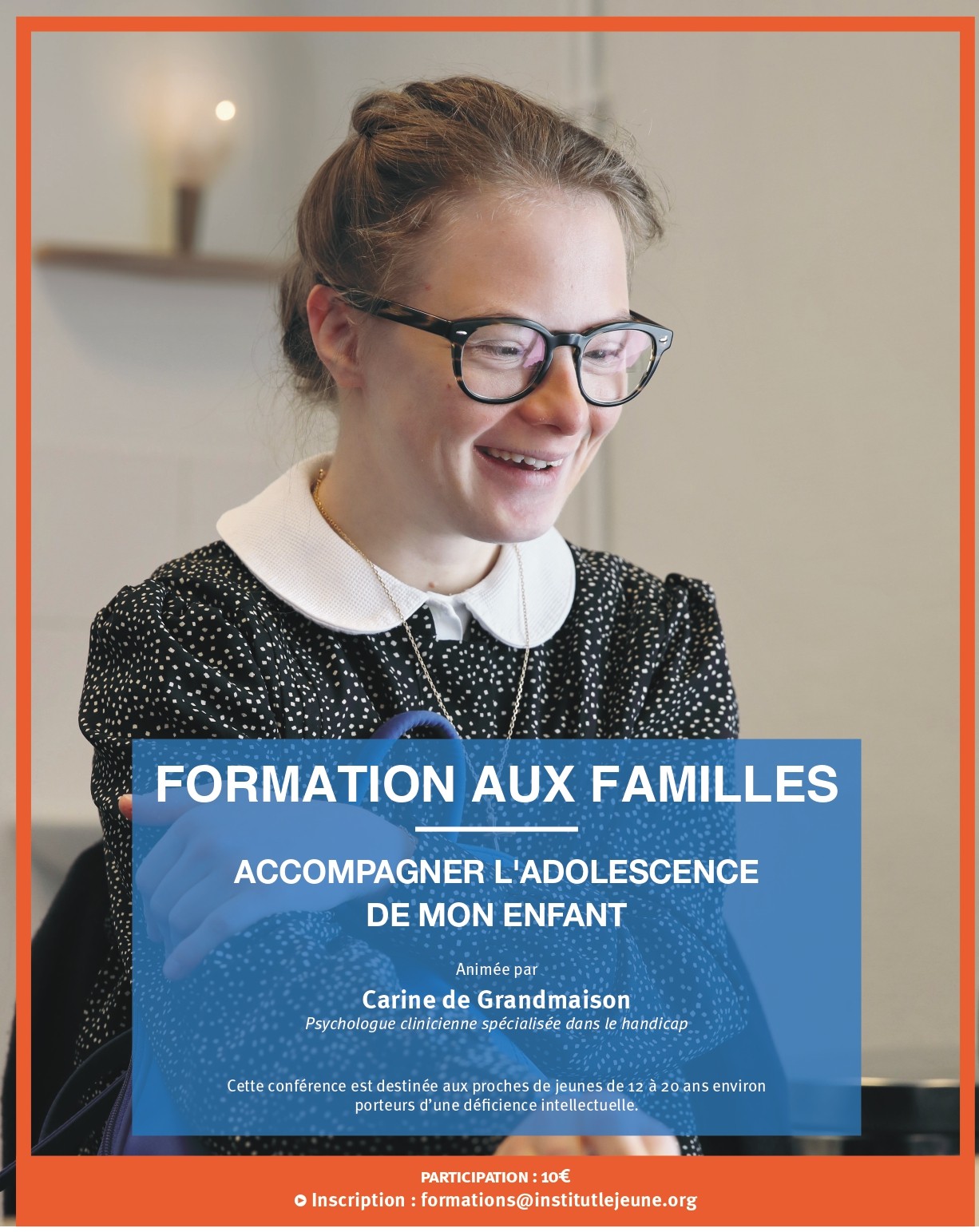 Mme de Grandmaison abordera les bouleversements psychiques spécifiques de cette période de la vie, les relations avec la famille, la fratrie, la confiance en soi et l'estime de soi, les difficultés propres au handicap, ... et ceci dans un cadre général.