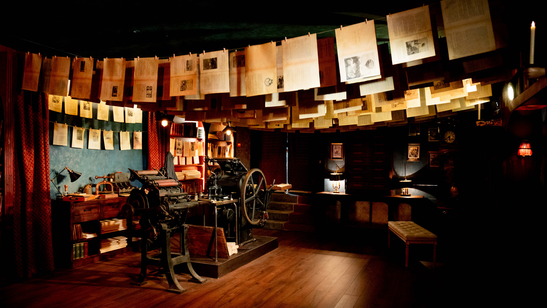Par petits groupes, vous voyagez de pièce en pièce et progressez ainsi dans l’histoire. Le Nautilus, la fusée, la montgolfière, l’imprimerie : nos décors monumentaux vous plongent dans l’univers extraordinaire de Jules Verne.